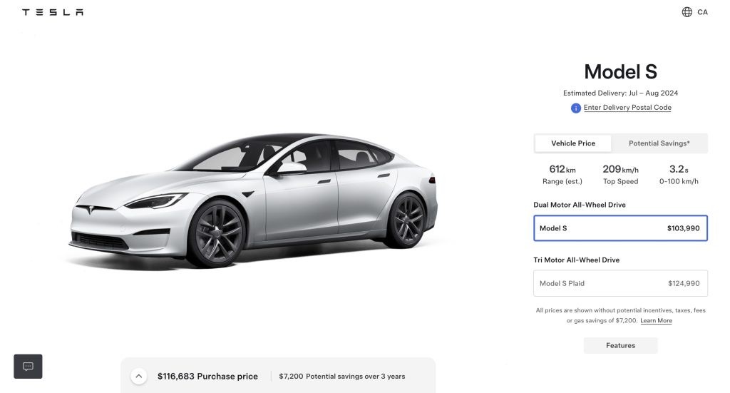In Canada, industry watchers have observed that the Model S AWD has seen a price increase of CAD 6,000, resulting in the all-electric sedan now starting at CAD $103,990. The Tesla Model S Plaid, on the other hand, received a smaller CAD 2,000 price increase, with the top-tier all-electric sedan now costing CAD 124,990 before options.