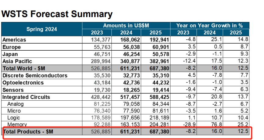 The latest semiconductor industry outlook data released by the World Semiconductor Trade Statistics (WSTS) organization recently shows that the global semiconductor market is expected to experience a very strong recovery trend in 2024, with WSTS significantly raising its sales forecast for the global semiconductor market in 2024 compared to the end of 2023. For 2024, WSTS predicts a market size of $611 billion, which means a significant increase of 16% compared to the previous year, and this is a substantial upward revision from the end of 2023 forecast.