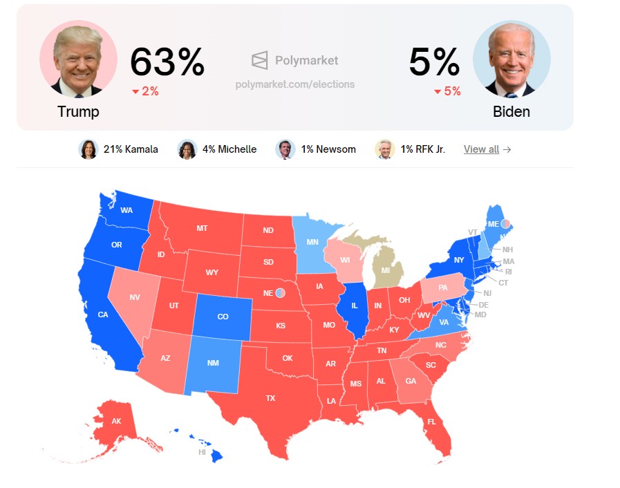 According to the US 2024 election prediction platform Polymarket, Trump's probability of winning the November election had soared by over 10 percentage points after the shooting incident, reaching an astonishing 75%, currently hovering around 63%. Meanwhile, his competitor Biden's chances of winning have plummeted to around 5%, and the support rate for US Vice President Harris has risen to around 20%, but still cannot be compared to Trump.
