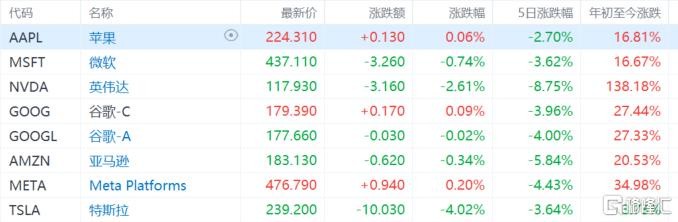 The "Big Seven" tech giants saw significant declines, with Amazon dropping over 5%, Google A and Meta dropping over 4%, Microsoft and Tesla dropping over 3%, and Apple dropping over 2%.