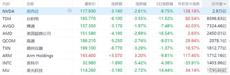 Among individual stocks, AMD fell over 16%, Micron Technology fell over 14%, TSMC fell over 11%, ARM fell over 9%, Qualcomm and NVIDIA fell over 8%, Broadcom fell over 7%, and Intel fell over 4%.