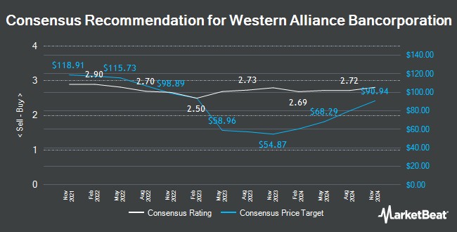 Other analysts have also recently issued reports about the stock. Truist Financial lifted their target price on shares of Western Alliance Bancorporation from $74.00 to $88.00 and gave the stock a "buy" rating in a research note on Monday. Keefe, Bruyette & Woods lowered their target price on shares of Western Alliance Bancorporation from $79.00 to $74.00 and set an "outperform" rating for the company in a research note on Monday, April 22nd. Wedbush reissued an "outperform" rating and issued a $70.00 price target on shares of Western Alliance Bancorporation in a report on Wednesday, May 8th. DA Davidson cut their price target on shares of Western Alliance Bancorporation from $85.00 to $78.00 and set a "buy" rating for the company in a report on Monday, April 22nd. Finally, Barclays boosted their price target on shares of Western Alliance Bancorporation from $86.00 to $92.00 and gave the stock an "overweight" rating in a report on Monday. Three research analysts have rated the stock with a hold rating and thirteen have assigned a buy rating to the company. Based on data from MarketBeat, the stock presently has an average rating of "Moderate Buy" and a consensus price target of $84.27.