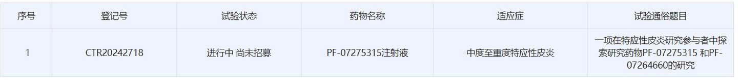 7 月 23 日,中國藥物臨牀試驗登記與信息公示平台顯示,輝瑞在國內登記了一項Ⅱ期臨牀試驗,以評估 PF-07275315 和 PF-07264660 在中度至重度特應性皮炎成人受試者中的療效和安全性。其中,PF-07275315 是一款靶向 IL-4×IL-13×TSLP 的三特異性抗體,PF-07264660 是一款靶向 IL-4×IL-13×IL-33 的三特異性抗體。特應性皮炎 (AD) 是一種常見的慢性、複發性、炎症性皮膚病。IL-4 和 IL-13 是 AD 發病的重要細胞因子,在 AD 的發生發展中起着關鍵作用。輝瑞擬開發這兩款三抗藥物用於治療特應性皮炎適應症。在海外,這兩款在研新藥此前已進入 2 期臨牀試驗階段。