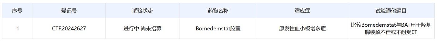 Public information indicates that Merck is conducting crucial Phase 3 randomized clinical trials for bomedemstat to evaluate its efficacy in patients with essential thrombocythemia (ET). The initiation of Phase 3 studies in China also means that the efficacy and safety of this drug will be studied in the Chinese patient population