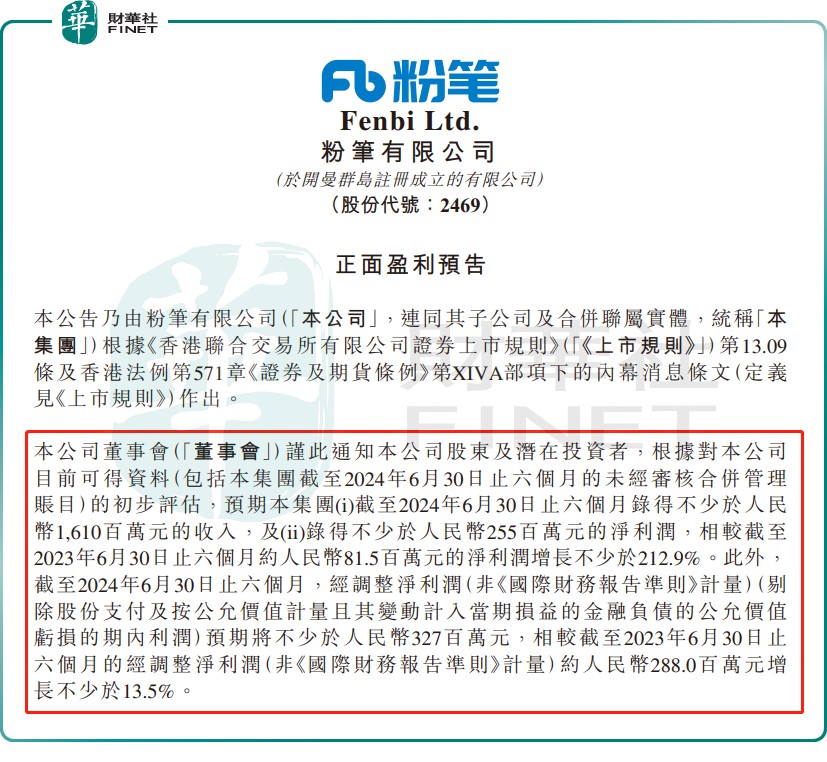 On July 25, FENBI announced good news, expecting revenue in the first half of 2024 to be no less than RMB 1.61 billion; net profit is expected to be no less than RMB 255 million, a year-on-year increase of no less than 212.9%; and adjusted net profit is expected to be no less than RMB 327 million, a year-on-year increase of no less than 13.5%.