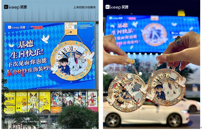 風靡全球的經典動漫 IP 之一柯南,經過十幾年的運營發展,其受眾羣體覆蓋青少年和年輕女性羣體,與 Keep 獎牌用户畫像基本一致。2024 年 4 月,Keep 上線了第一期以柯南、新蘭為主角設計的 “命運之輪” 主題活動,收穫了良好的用户口碑和反饋,成為今年最受歡迎的 IP 賽事之一。於是,Keep 在 6 月份又火速推出了以柯南和基德為主要人物的第二期活動,併為慶祝基德生日在全國七大城市打造了八塊應援大屏,吸引了眾多粉絲前去打卡和分享,截至目前 Keep 柯南系列賽事的累計報名人數已超過 20 萬,小紅書上關於該賽事的話題討論超過 200 萬。