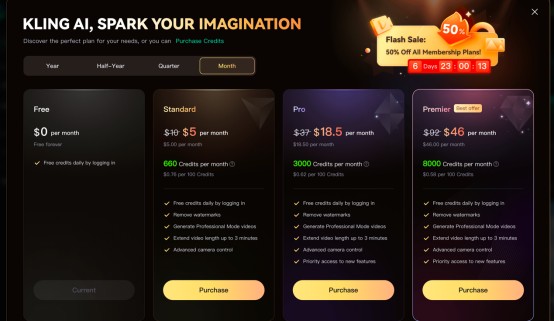 可靈 AI 還同步對全球會員推出了「5 折」優惠活動,限時一週。其中,黃金會員(Standard)最低價僅每月 5 美元;鉑金會員(Pro)、鑽石會員(Premier)每月分別低至 18.5 美元和 46 美元。