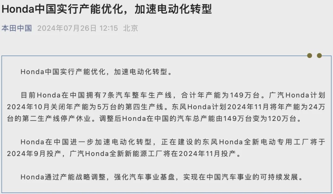 Honda quickly responded, saying that they have seven complete vehicle production lines in China. The one closed in October was the fourth production line of GAC Honda with an annual capacity of 50,000 vehicles, and the one shut down in November was the second production line of Dongfeng Honda with an annual capacity of 240,000 vehicles.