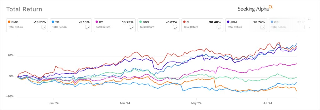Canadian banks have continued to underperform their American and European peers this year. In the US, companies like Citigroup, JPMorgan, and Goldman Sachs have all rallied by double-digits this year.