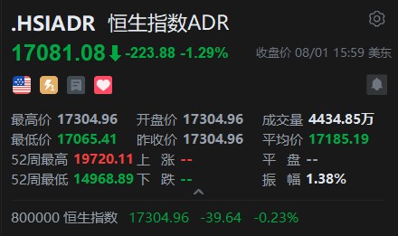 智通財經 APP 獲悉,週四美股三大指數集體下跌,恒生指數 ADR 下跌,按比例計算,收報 17081.08 點,較香港收市下跌 223.88 點或 1.29%。