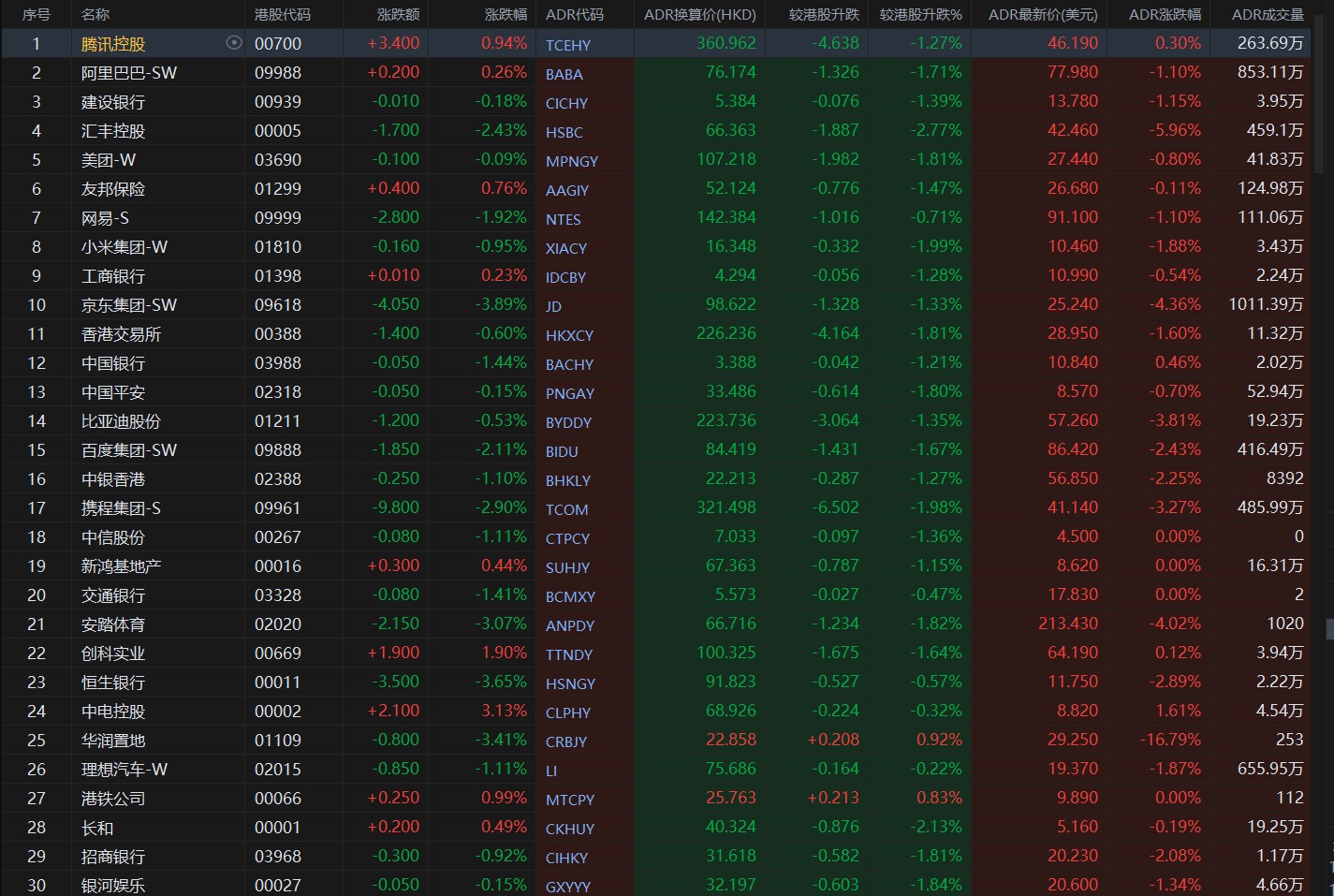 週四美股三大指數集體下跌,恒生指數 ADR 下跌,按比例計算,收報 17081.08 點,較香港收市下跌 223.88 點或 1.29%。大型藍籌股近乎全線下跌,滙豐控股收報 66.363 港元,較香港收市下跌 2.77%;騰訊控股收報 360.962 港元,較香港收市下跌 1.27%。