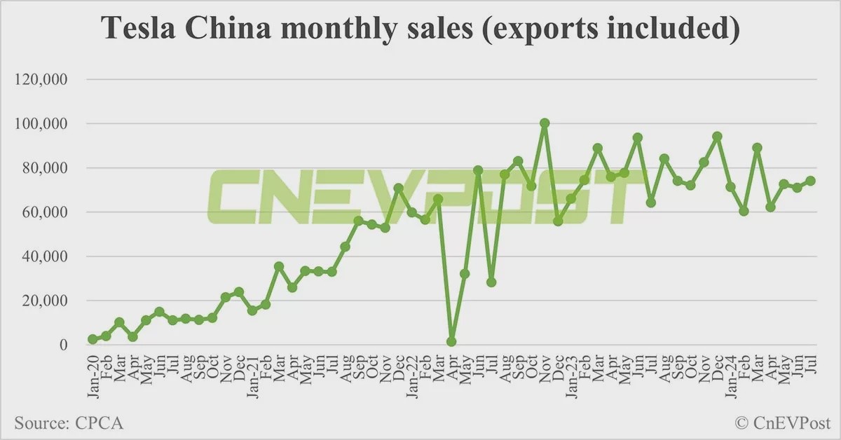 Tesla China sells 74,117 cars in Jul, up 4.38% from Jun