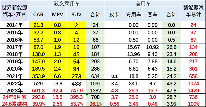 The structure of global new energy vehicles is mainly focused on narrow passenger vehicles, accounting for 96.1% from January to June 2024, while new energy commercial vehicles accounted for 3.9%.