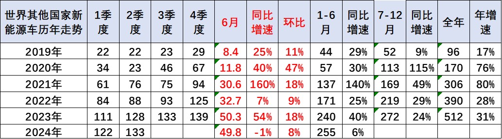 Overall, new energy trends in markets outside of China were relatively weak, with overseas new energy performance relatively lackluster starting this year. Due to the still weak trends in new energy in Europe and the United States in June, the growth rate from January to June dropped to 6%.