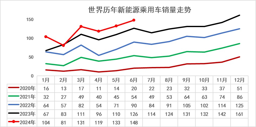 In June 2024, global new energy passenger car sales reached 1.48 million units, a 17% year-on-year increase and a 12% increase from the previous month. From January to June 2024, global new energy passenger car sales reached 7.17 million units, a 21% year-on-year increase. Due to the slowdown in new energy trends in Europe and the United States, the global new energy market showed a significant slowdown in the first half of the year compared to previous years.