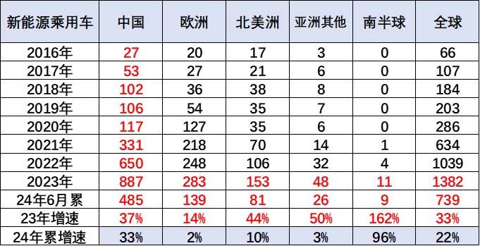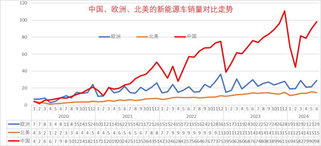 In the first half of this year, Europe sold 1.39 million new energy passenger vehicles, with a growth rate of 2%; North America sold 0.81 million new energy passenger vehicles, with a growth rate of 10%. Against the backdrop of increasing supply of fuel vehicles, the performance of new energy vehicles in Europe and America is relatively average.