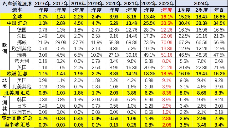 The overall penetration rate of new energy vehicles worldwide is showing a rapid upward trend, reaching 13% in 2022, 16% in 2023, slightly lower in early 2024 with 15% in Q1 and 18.4% in Q2, resulting in a penetration rate of 16.8% in the first half of the year. In 2024, the penetration rate is 34.5% in China, 16.6% in Germany, 66.8% in Norway, 9.2% in the United States, and 3% in Japan, highlighting the significant imbalance in the global development of new energy.