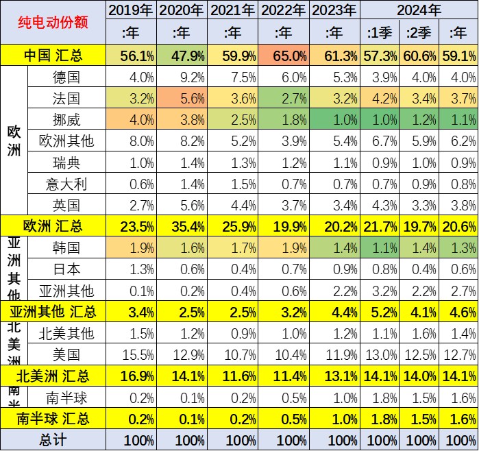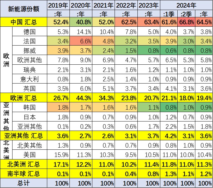 The European new energy market in 2021 was weak due to the impact of the pandemic. In 2022, still affected by the pandemic, Europe's market share decreased significantly compared to 2021, with a slight decrease in 2023, and a noticeable decline in the first half of 2024.