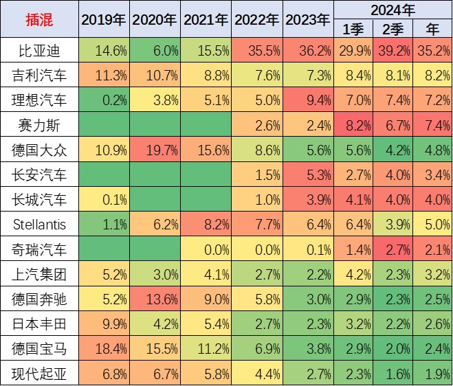 Looking at the market share of automotive companies in plug-in hybrids, BYD stands out. BYD's global plug-in hybrid market share dropped to a low of 6% in 2020, but rose to 16% in 2021, 36% in 2023, and maintained a good share of 35% in 2024, reaching 39% in the second quarter, demonstrating BYD's leadership in the plug-in hybrid market.