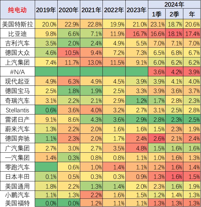 Looking at the market share of car manufacturers in pure electric vehicles, BYD's share has continued to rise overall. From 2017 to 2021, it maintained a share of over 7%, but in 2022, the share rose to 12%, in 2023 to 17%, and in 2024, it maintained a good performance at 17.4% In the pure electric vehicle sector, Tesla's market share performance is relatively strong, maintaining its world-leading position in pure electric vehicles. In 2020, Tesla held around 23% of the market share, and currently maintains a strong trend at 21%.