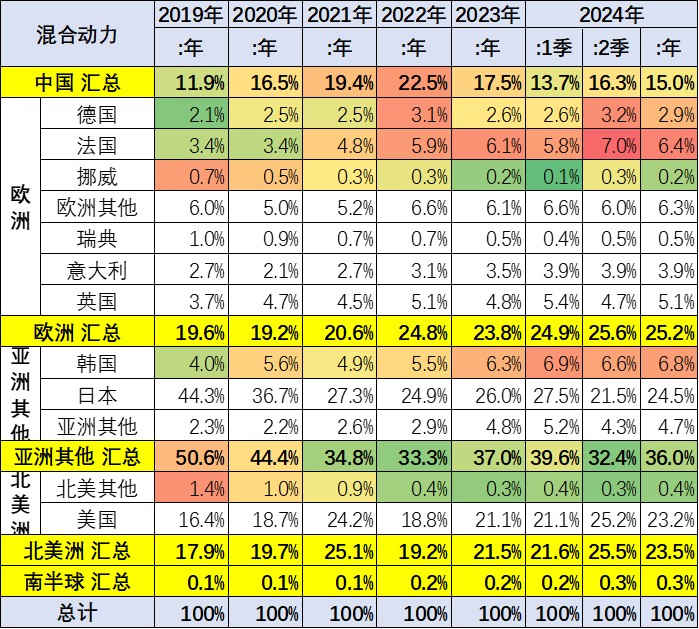 In the past two years, China's hybrid market has developed rapidly. In 2022, it became the largest hybrid market in the world. In 2023, the market share of hybrid vehicles declined, while the hybrid markets in the United States and Japan rebounded.