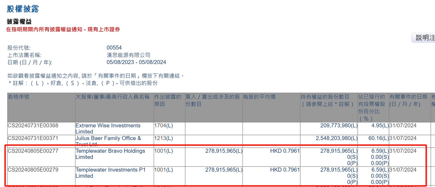 據香港聯交所最新數據顯示,7 月 31 日,Templewater Bravo Holdings Limited 增持漢思能源 2.78915965 億股,每股作價 0.7961 港元,成交額 2.22 億港元。增持後最新持股數目約為 2.8 億股,持股比例為 6.59%。本交易涉及其他關聯方:Templewater Investments P1 Limited。