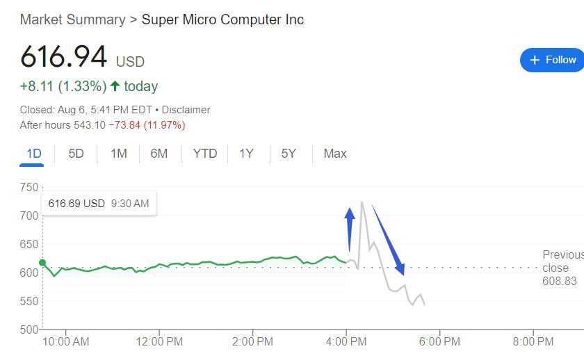 財報公佈後,週二收漲超 1.3% 的超微電腦(SMCI)股價盤後跳漲,一度漲超 17%,後回吐所有漲幅轉跌,盤後跌超 10%。