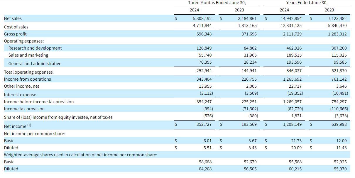 截至 6 月末的整個 2024 財年,超微電腦的淨銷售為 149.4 億美元,大致符合公司指引區間 147 億至 151 億美元的中值,較前一財年增長約 110%,體現了市場對 AI 芯片基礎設施服務器的強勁需求。其中,二季度的增長相比今年一季度有所放緩,仍有三位數增速。