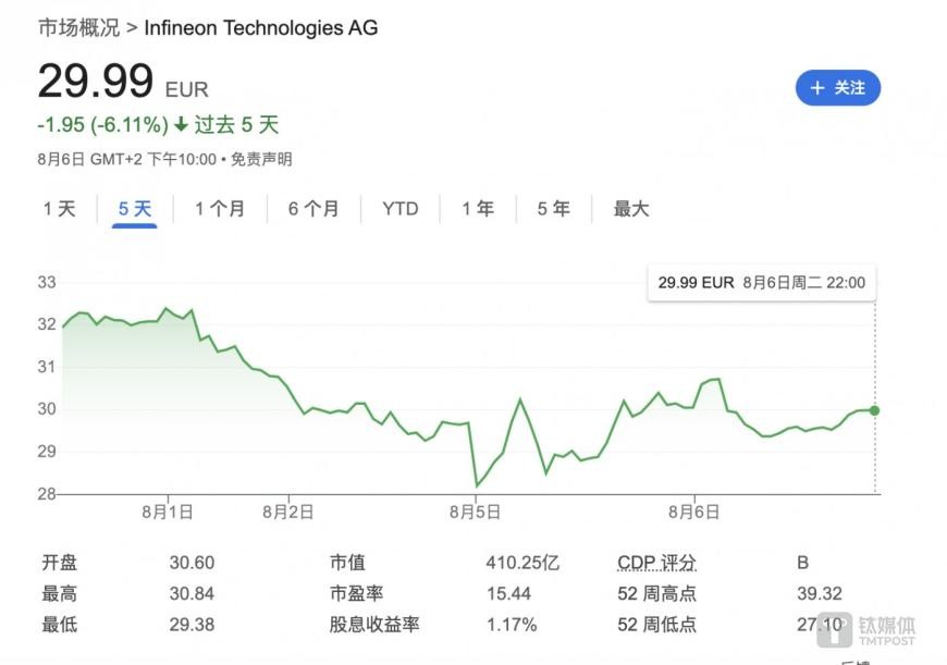 Affected by the above news, Infineon's stock price has been fluctuating over the past three trading days, falling by more than 5% at one point. As of midday on the 7th, Infineon's European stock was at 29.99 euros per share, down 0.22%. Over the past 5 days, Infineon's stock price has fallen by 6.11%. Year-to-date, the stock has dropped by 17.72% in Europe and 18.43% in the US.