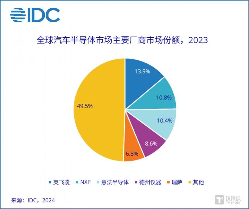 The latest data released by research firm IDC on August 7th shows that in 2023, the top 5 companies in the global automotive semiconductor market held over 50% market share. Among them, Infineon ranked first with a market share of 13.9%; followed by NXP and STMicroelectronics with market shares of 10.8% and 10.4% respectively; Texas Instruments and Renesas Electronics ranked fourth and fifth, with market shares of 8.6% and 6.8% respectively.