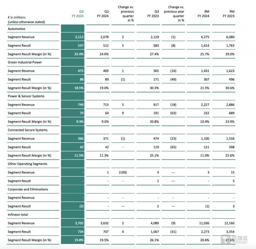 According to the report, Infineon's revenue for the third quarter was 3.702 billion euros, up 2% quarter-on-quarter but down 9% year-on-year, falling below the expected 3.8 billion euros; the gross margin was 40.2%, compared to 38.6% in the previous quarter; the adjusted gross margin increased to 42.2%, up from 41.1% in the second quarter; the departmental operating profit reached 734 million euros, down 31% year-on-year; the departmental performance profit margin was 19.8%, a decrease of 6.6 percentage points from the same period last year's 26.1%; the net profit was 403 million euros, a 52% decrease year-on-year, lower than the expected 447 million euros.