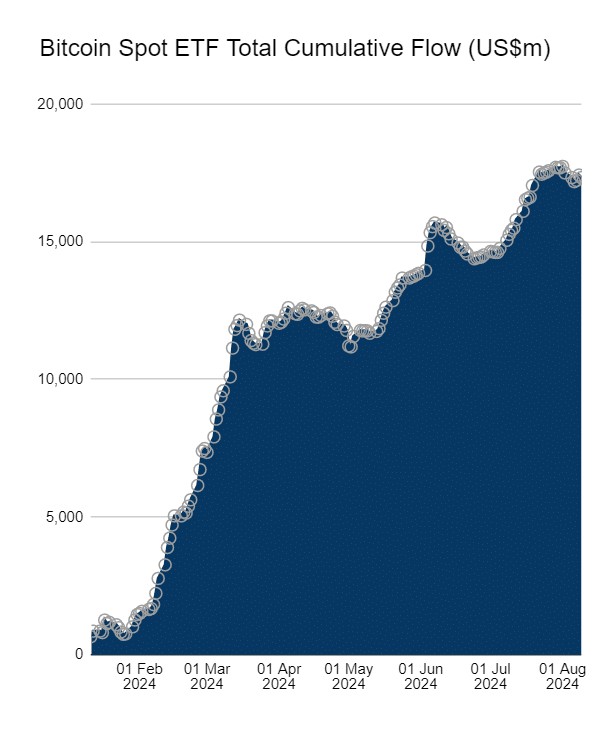 Furthermore, cumulative data from Farside Investors shows that U.S. BTC spot ETFs have garnered a net inflow of $17.341 billion since their inception.