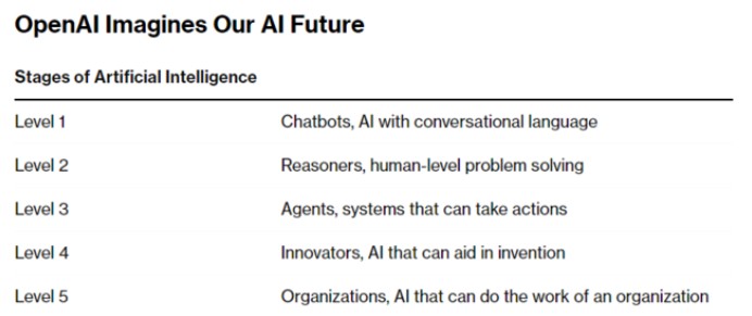 這就和 OpenAI 想要的 “推理能力” 對上了號。而且,OpenAI 在 11 日還公佈了未來 AI 發展的五級路線圖: