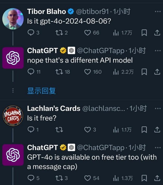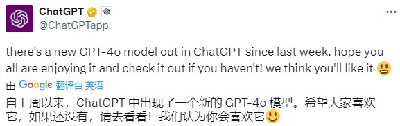 13 日,ChatGPT 在社交媒體 X 上發文稱,聊天機器人家族的 GPT-4o 模型又迎來更新,而且強調這次會很不一樣,這個模型也不是 OpenAI 最新的 API 端 GPT-4o 0806 模型,目前免費用户也可以用這個模型,只不過有使用次數限制。