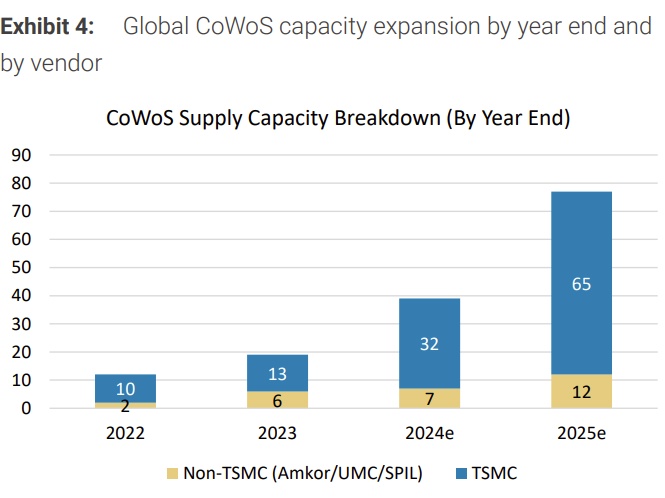 京元電子也確認其主要 AI GPU 客户英偉達已要求擴充新測試產能,進一步確認芯片產量不會在今年第四季度有較大變化。來自京元電子的產能利用率數據與我們對台積電的 CoWoS-L(一種先進封裝技術)產能的估計相似,第四季度產能約為 10kwpm。