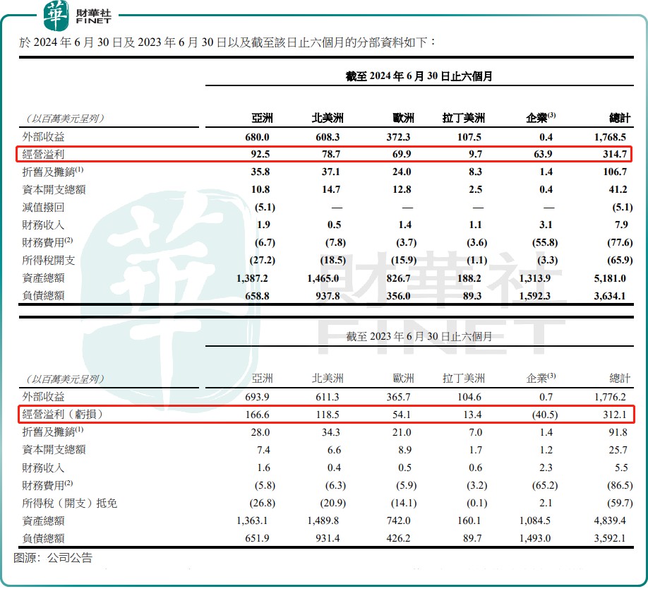 Samsonite International S.A.'s corporate divisions mainly include several groups engaged in franchise operations based on brand licensing and corporate headquarters functions and related expenses. Performance reports show that the operating profit of the corporate divisions in the first half of the year rebounded strongly to $63.9 million, but the operating profit in the Asian, North American, and Latin American markets all saw significant declines, with the operating profit in the Asian market at $92.5 million, a year-on-year decrease of 44.5%.