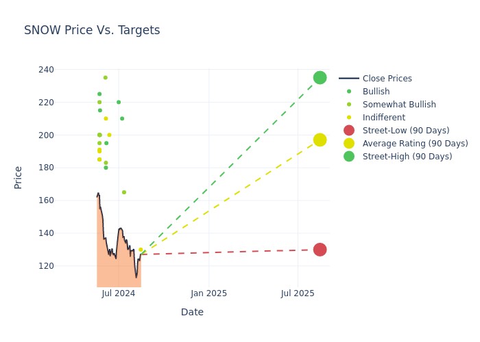 Analysts have set 12-month price targets for Snowflake, revealing an average target of $202.97, a high estimate of $240.00, and a low estimate of $130.00. Observing a downward trend, the current average is 4.39% lower than the prior average price target of $212.28.
