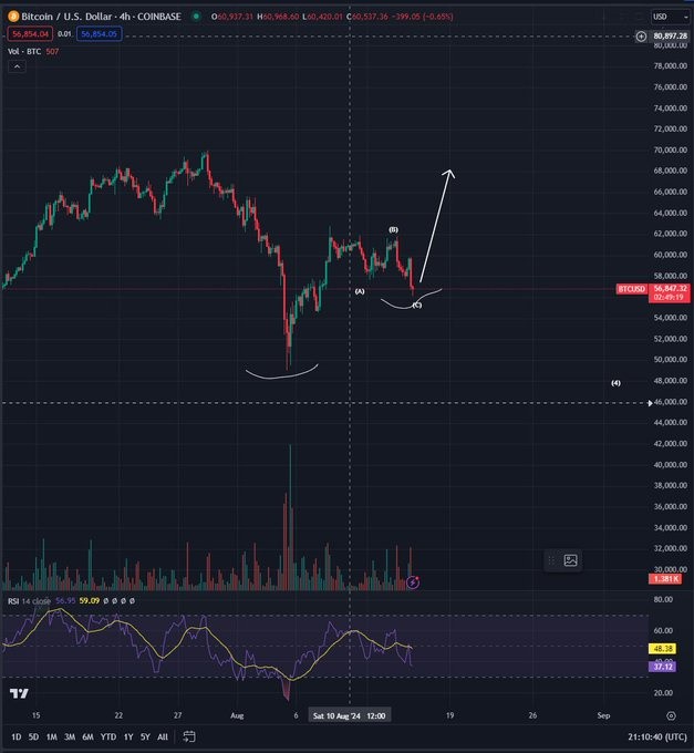 Pseudonymous crypto strategist Bluntz tells his 269,300 followers on the social media platform X that he believes Bitcoin has likely bottomed out after completing an ABC corrective move on the four-hour chart.