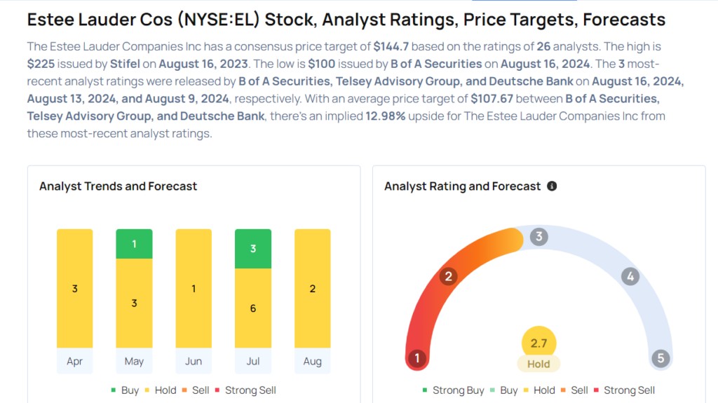 Estée Lauder Companies Inc. is set to report its Q4 earnings on Aug. 19, projecting 27 cents per share, up from 7 cents a year ago. Analysts expect revenue of $3.83 billion, an increase from $3.63 billion last year. The company's shares fell 0.2% to close at $178.97. Recent analyst ratings reflect downgrades from multiple firms including B of A and Deutsche Bank, with price targets being cut significantly. Analysts maintain varied ratings, with accuracy rates around 62-69%.