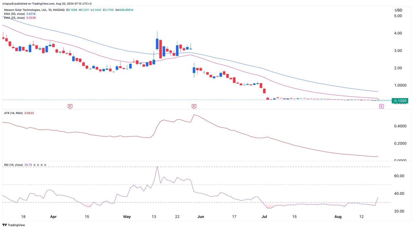 The daily chart shows that the MAXN share price has moved sideways in the past few months. Also, the Average True Range (ATR) indicator continued to its lowest point on record, signaling that the volatility has died.