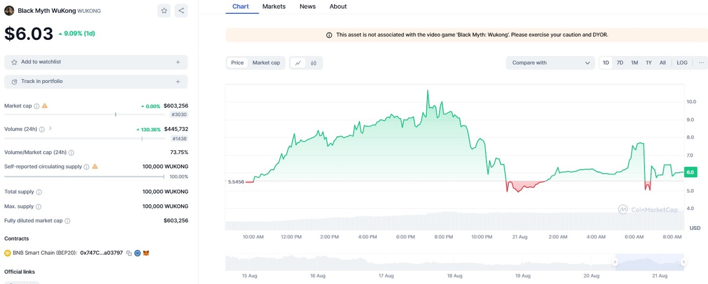 With the high popularity of "Black Myth: Wukong", the WUKONG meme coin also surged, reaching a high of $10.67 at one point, with an increase of nearly 100%, but then falling back to $6.03.