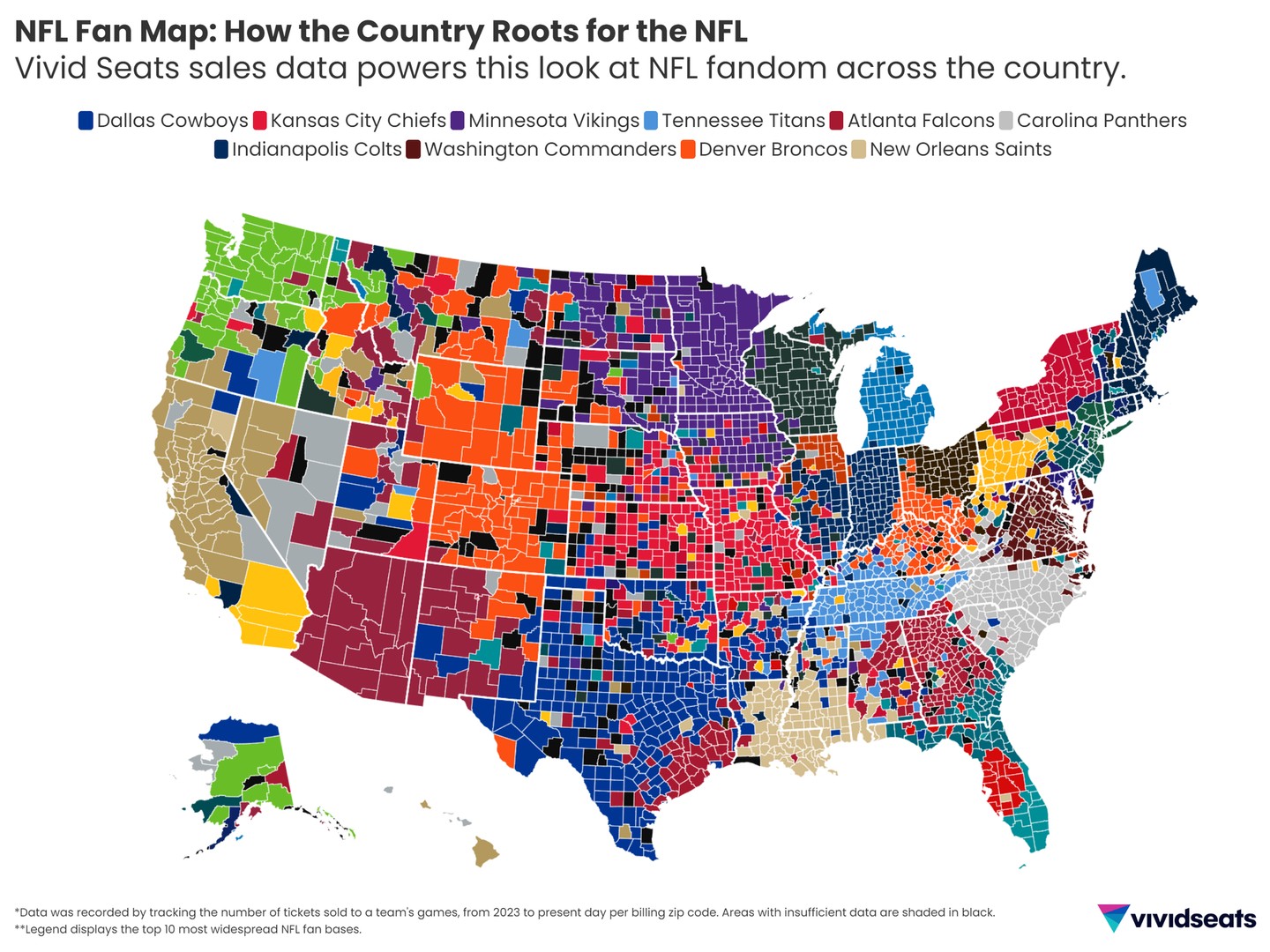 Endzone to Endzone: When analyzing team sales per county**, Vivid Seats data found which fans held down the fort and consistently showed up for their teams. The most widespread fan base proved to be the Dallas Cowboys claiming 279 counties mainly across the Lone Star State, Oklahoma, Arkansas, and Southeast New Mexico. Following in second place with 255 counties are reigning champions the Kansas City Chiefs, with the Minnesota Vikings ranking in third place for 231 counties.Fans can explore the interactive map here to see which team claimed their local county and state.