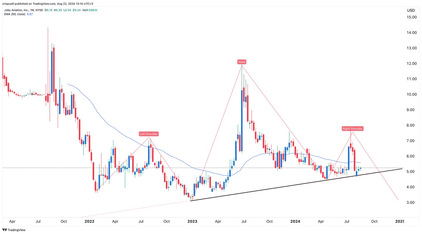 Joby Aviation's stock has plummeted over 20% this year and 70% from its all-time high due to significant losses, with a 2023 net loss of millions. Despite a strong balance sheet with substantial cash reserves, the company faces challenges including reducing interest income and potential cash raises in 2025 or 2026. Joby is making progress in R&D with plans for commercialization by 2025-2026 but must contend with competition in the eVTOL and hydrogen markets. Additionally, the stock has formed a bearish head and shoulders pattern, indicating potential further decline.