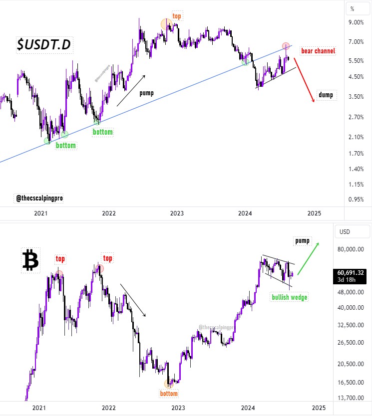 Mags 指出了泰達幣(USDT.D)和比特幣(BTC)主導地位之間的反向相關性,指出泰達幣(USDT.D)趨勢支撐線的最近突破可能導致比特幣的看漲延續模式。