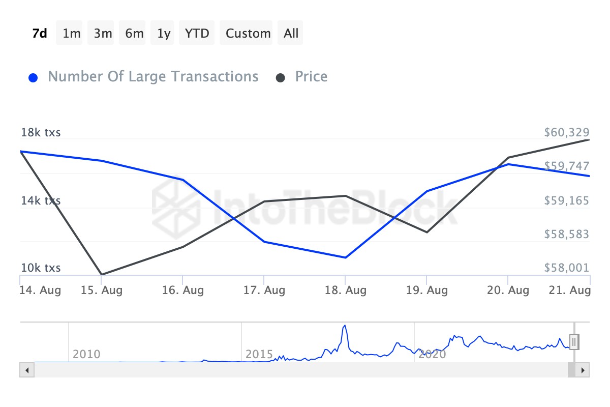 根據 IntoTheBlock 的數據,這些大額交易的數量在過去一週略有下降,從 17,000 多下降到稍低於 16,000。