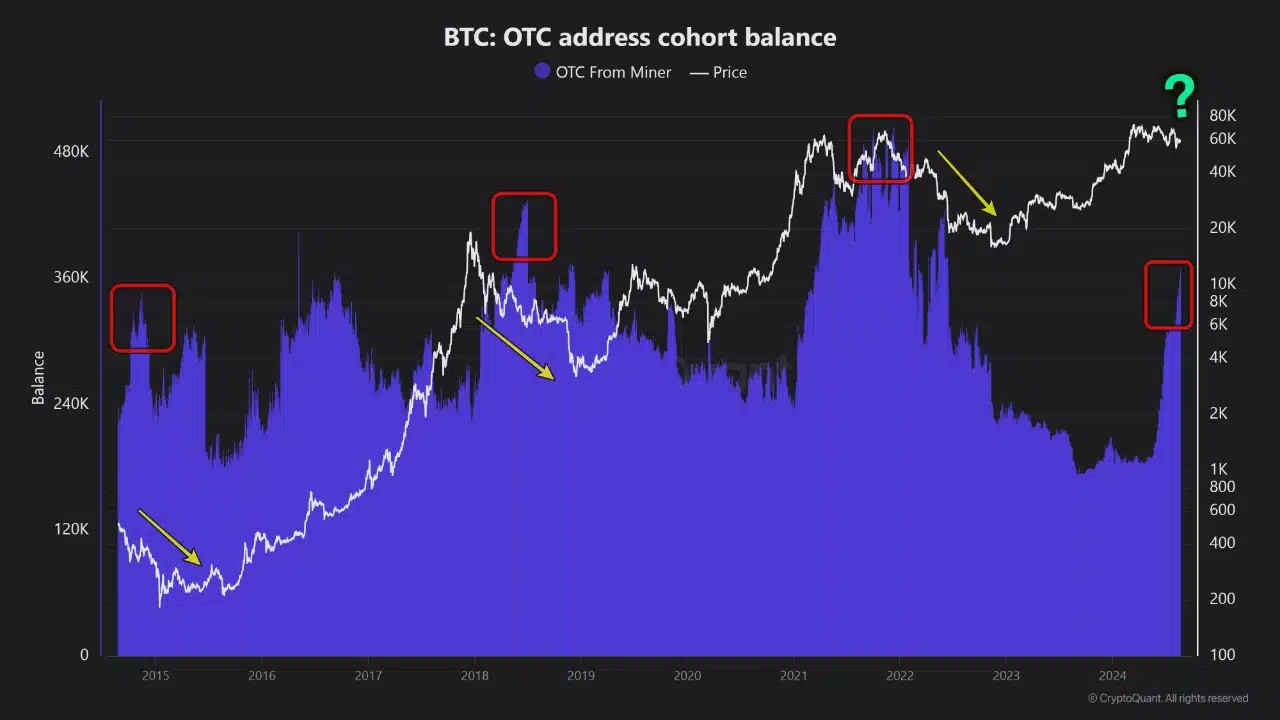 根據 CryptoQuant 最近的一份報告,場外交易台持有的比特幣餘額激增至兩年來的最高水平。