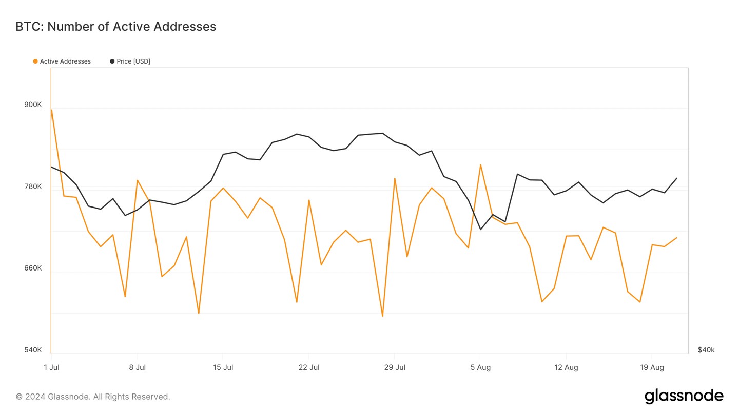 Glassnode 的數據顯示,比特幣活躍地址數量,這是網絡活動的一個關鍵指標,在過去一個月中出現了顯著下降。