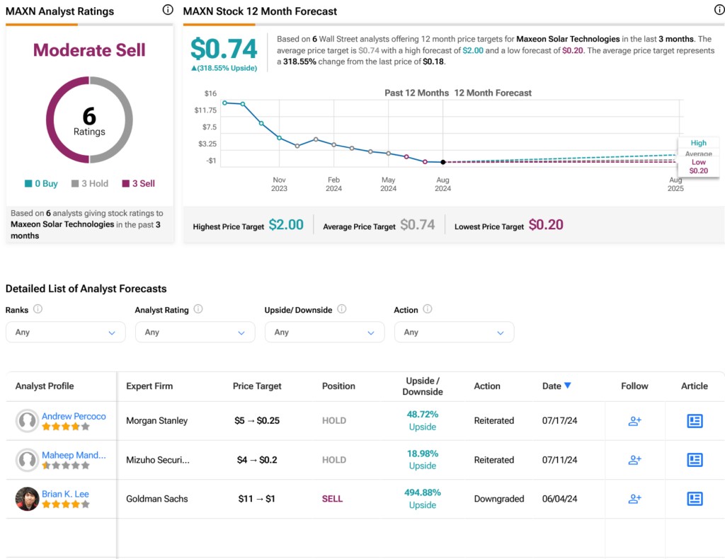 Turning to Wall Street, analysts have a Moderate Sell consensus rating on MAXN stock based on three Holds and three Sells assigned in the past three months, as indicated by the graphic below. After a 98.84% loss in its share price over the past year, the average MAXN price target of $0.74 per share implies 318.55% upside potential.