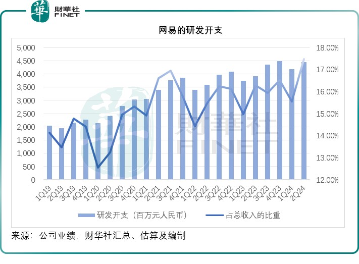 However, the largest increase in operating expenses should be in research and development expenses. In the second quarter, NetEase's R&D expenses increased by 14% year-on-year to 4.456 billion yuan, accounting for 17.48% of total revenue, up from 16.28% in the same period last year, as shown in the chart below.