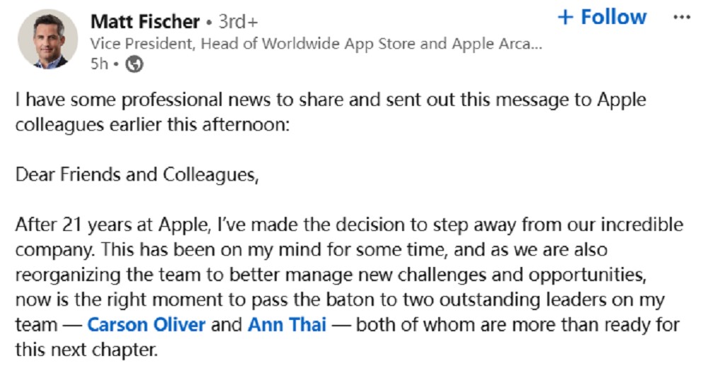 According to the well-known Apple whistleblower Mark Gurman, Apple will make major adjustments to its App Store business. Matt Fischer, the vice president who has been in charge of the App Store business for 14 years, will leave Apple in October this year, and the App Store team will be split into 2 departments.